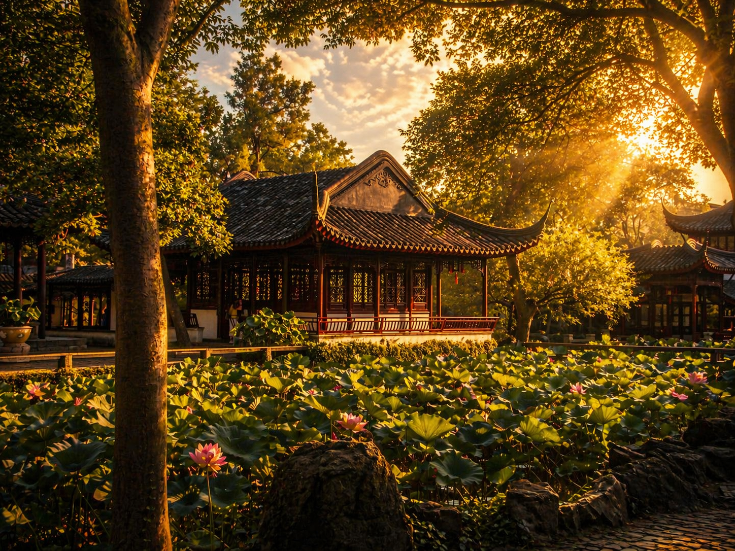 Сад скромного Чиновника (Zhuo Zheng Yuan 拙政园) был разбит в 1509 году и является великолепным примером китайской садово-парковой архитектуры и классического ландшафтного дизайна. В 16 веке чиновник Ан Сяньшэнь, обвиненный в коррупции и отстраненный от службы, приступил к возведению этого парка. А название для сада было позаимствовано Ан Сяньшэнем из классического китайского произведения, в котором главный персонаж – «скромный чиновник» - посвятил себя садоводству. К проектированию и строительству был также привлечен один из известнейших художников того времени – Вэн Чжэмин – который смог решить непростую инженерную задачу по превращению болота в сад: вместо осушения участка целиком, было вырыто несколько водоемов, а остальная земля поднята в виде насыпных островов.