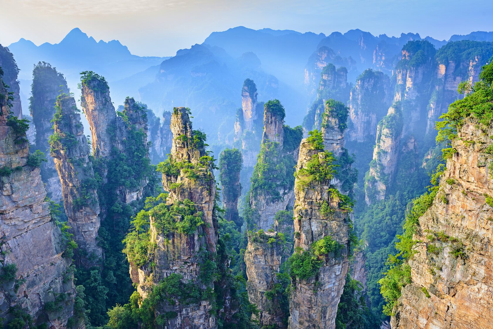 Национальный лесопарк «Чжанцзяцзе» в провинции Хунань, Китай, — это старейший национальный парк Китая, знаменитый своими сюрреалистичными кварцевыми песчаниковыми столбами, в живописной зоне Юаньцзяцзе, туманными вершинами, ущельями и уникальной флорой и фауной, вдохновившими на создание «парящих гор» в фильме «Аватар».