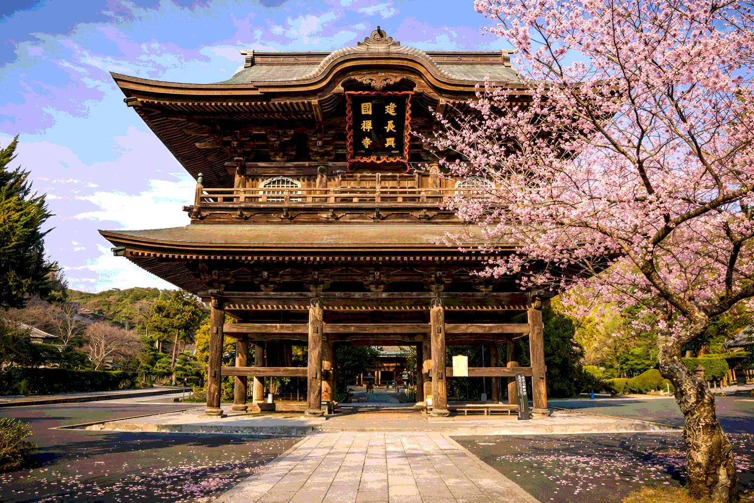Энгакудзи - храмовый комплекс, расположенный в Камакура - древней столице Японии был сооружен в 1282. Лаконичность цвета, искусная резьба по дереву без позолоты и лакированного покрытия, влияние религиозной и философской жизни самураев - воинов того времени. Храмовый комплекс Энгакудзи входит в список пяти самых авторитетных дзен-буддистских монастырей Камакуры и обладает одной из священных реликвией - зубом Будды, привезенного из Китая, который хранится в зале Сяриден. Но войти внутрь Сяридэна можно только в дни новогодних празднеств. По дорожке можно подняться еще выше, где на вершине холма стоит чайный домик. Отсюда открывается красивейший вид на город и его окрестности. Зал является национальным достоянием Японии. В настоящее время является центром медитаций-дза дзэн, проходящие здесь с эпохи Мэйдзи.